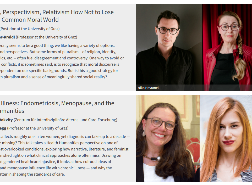 Impulse und Diskussionen über aktuelle wissenschaftliche Themen in Ducks Coffee Shop. Diesmal zu den Themen “Pluralism, Perspectivism, Relativism How Not to Lose Track of a Common Moral World” (Denis Džanić und Sonja Rinofner-Kreidl) und “In/Visible Illness: Endometriosis, Menopause, and the Health Humanities” (Alekszandra Rokvity und Ulla Kriebernegg).